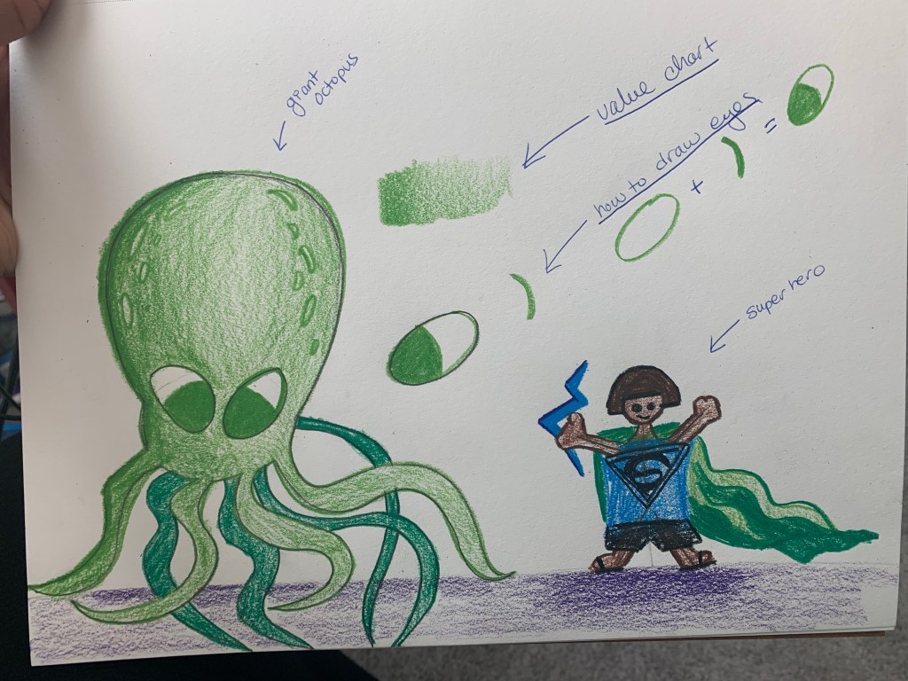 To keep the lesson engaging and fun we drew a giant octopus next to a human. I asked them to use the eyeball of the octopus to measure out the human body.