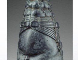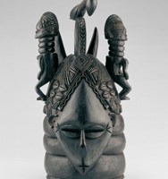 The sowei mask evokes an ideal. The deep, shiny black surface recalls the smooth skin of young initiates and the deep pools of water where Sande’s guardian spirit resides. The downcast eyes, scarification marks, demure mouth, and styled hair communicate dignity and composure. Neck rings and a high forehead add to the mask’s beauty.