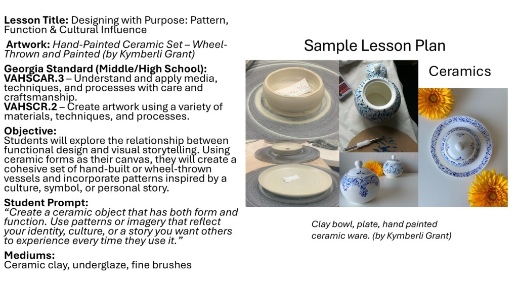 This page features selected sample lesson concepts I’ve developed, using my personal artwork as inspiration. Each lesson is aligned to Georgia Visual Arts Standards and designed to engage middle and high school learners in creative exploration, critical thinking, and self-expression.
